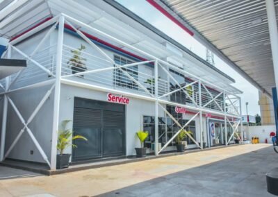 Fuel and Gas service station in the heart of Owerri, Imo State. Initial thoughts were to visually reflect the core business operations of the company as building elevation elements, completely enclosed in a structural exo-skeleton. We realized in the Mini-Mart/Lubrication Bay behind the Pump station canopy.